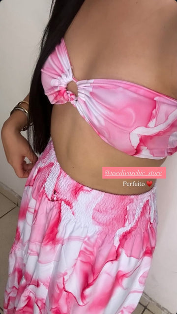 Conjunto Metalizado Pink Top Faixa com Saia Transpassada