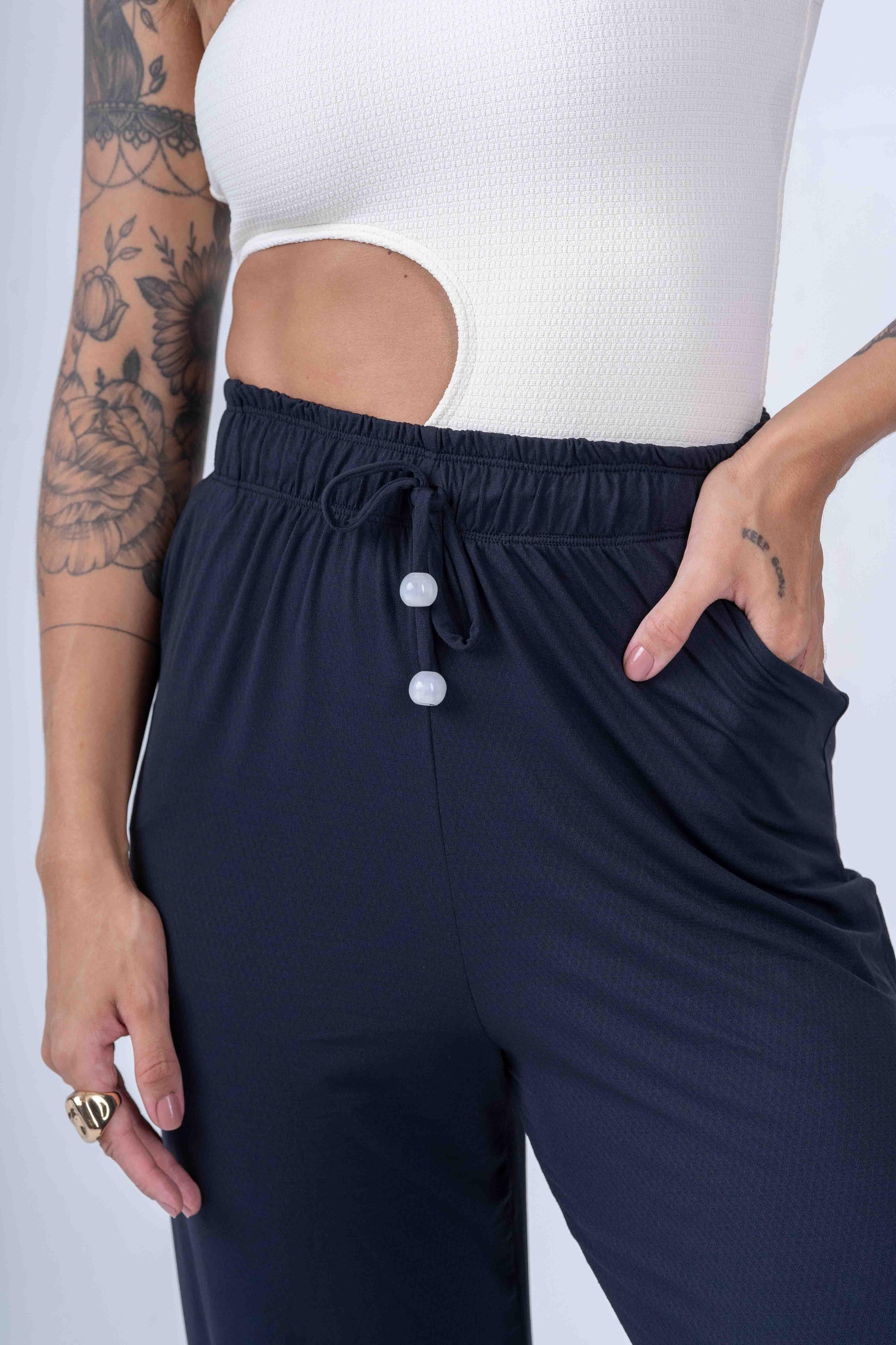 - Ajuste Personalizado: Graças à cintura alta e as cordinhas ajustáveis, você pode modelar a calça conforme suas preferências, garantindo conforto e estilo.