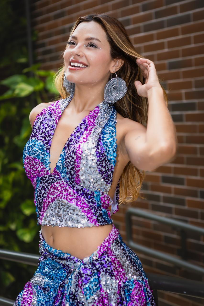 Conjunto vibrante e cheio de brilho composto por top e saia confeccionados com aplicação de paetês multicoloridos, formando um efeito moderno e festivo. O top possui modelagem frente única com decote profundo e caimento ajustado, valorizando o colo e a silhueta com elegância.