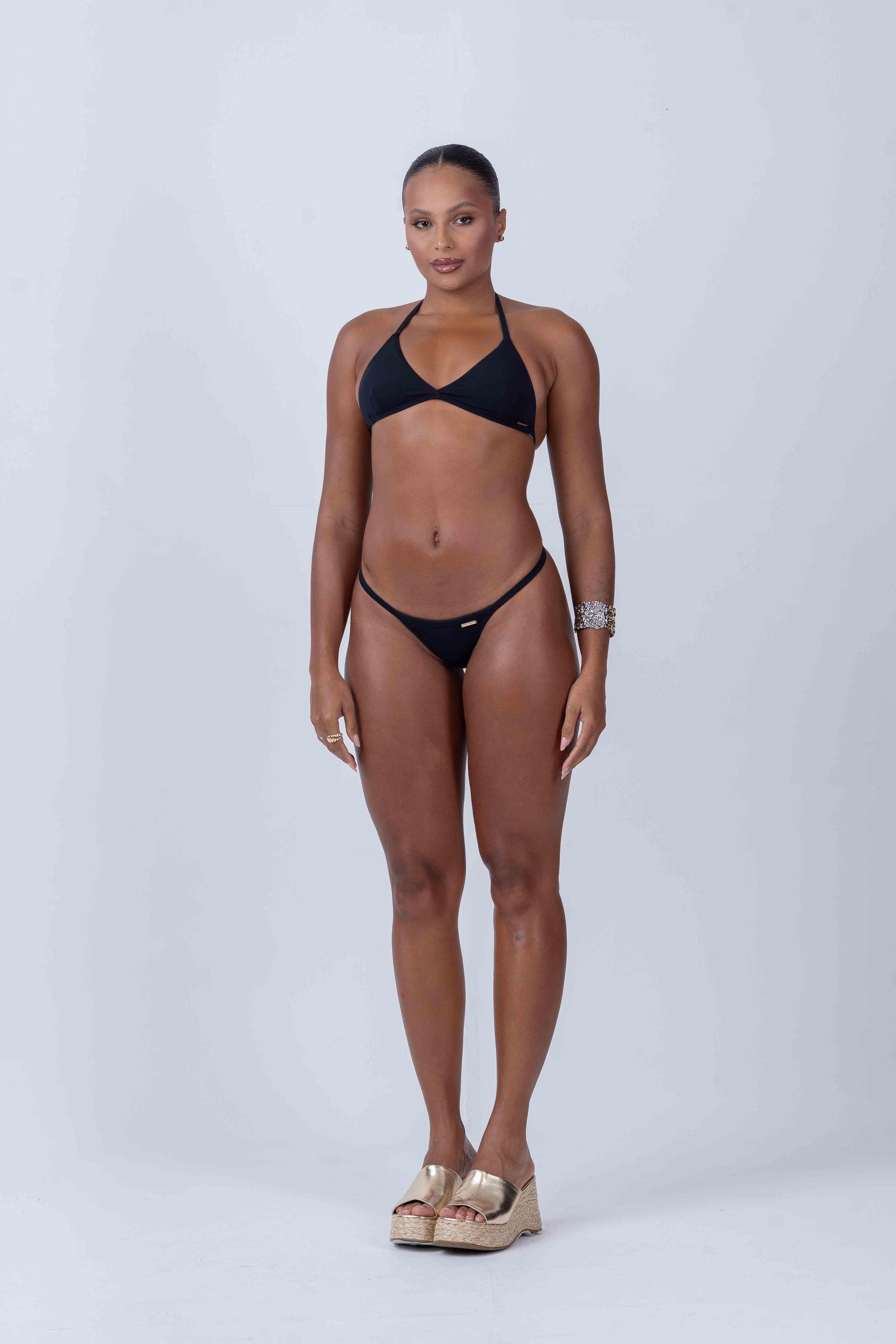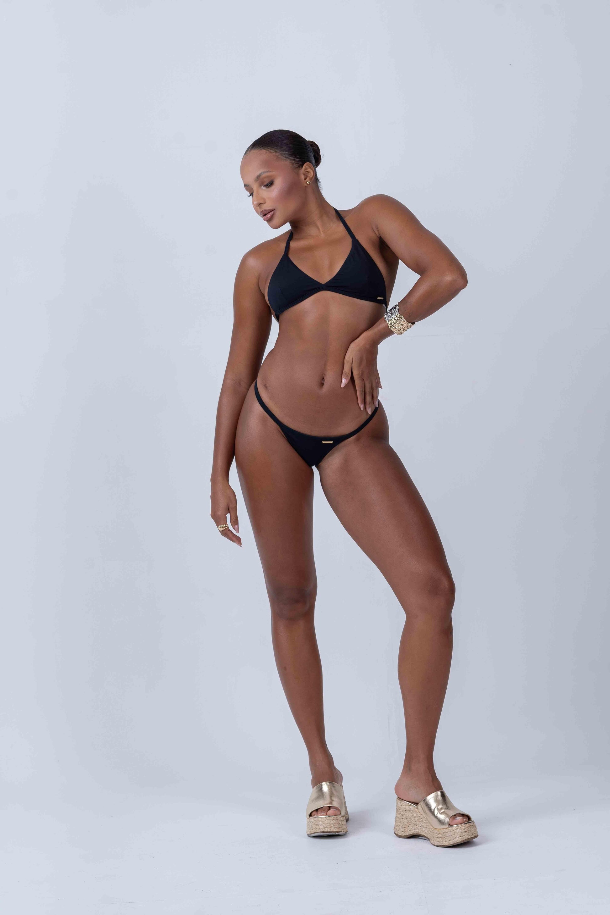 Se você deseja um biquíni que realce e modele o busto, o Top Cortininha Fixo Preto é uma excelente opção. Sua modelagem fixa proporciona mais sustentação e um caimento impecável. Para quem deseja alongar a silhueta, a Calcinha Asa Delta é a escolha perfeita.